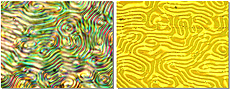 ![]() 液晶の偏光顕微鏡写真(左)とポリマーの 偏光顕微鏡写真(右) |