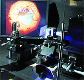 ![]() ダイヤモンドアンビルセルを用いた超高圧下での顕微分光測定の様子 |