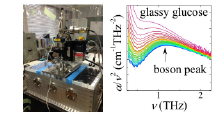 ![]() テラヘルツ時間領域分光装置(左)とグルコースガラスのボソンピーク(右)。 |