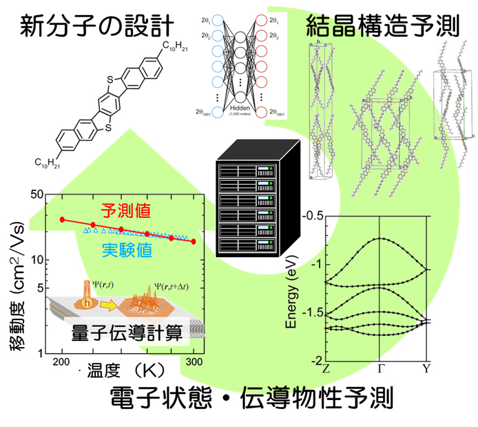 ![]() 新しい未知分子の化学構造式から結晶構造、そして伝導物性(機能)までを高精度に予測し、材料開発プロセスを高速化する概念図。 |